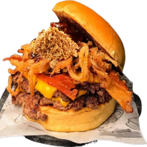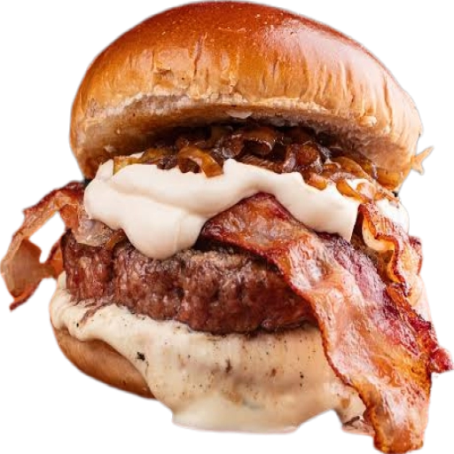 Um delicioso hambúrguer artesanal de 140 gramas com bacon e um saboroso queijo cheddar derretido.
